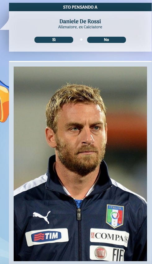 Dopo 25 domande, in cui Akinator alla fine arriva a capire che sto pensando ad un ex calciatore, mi propone un po’ a sorpresa Daniele De Rossi.