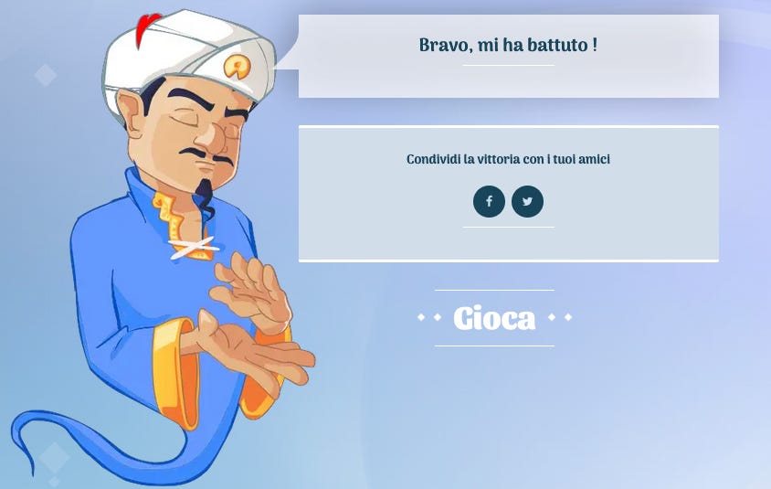 Recentemente ho recuperato un videogioco che ha fatto la storia dei browser games (i giochi che spopolavano nei primissimi anni 2000, da fare direttamente dal proprio browser): Akinator.